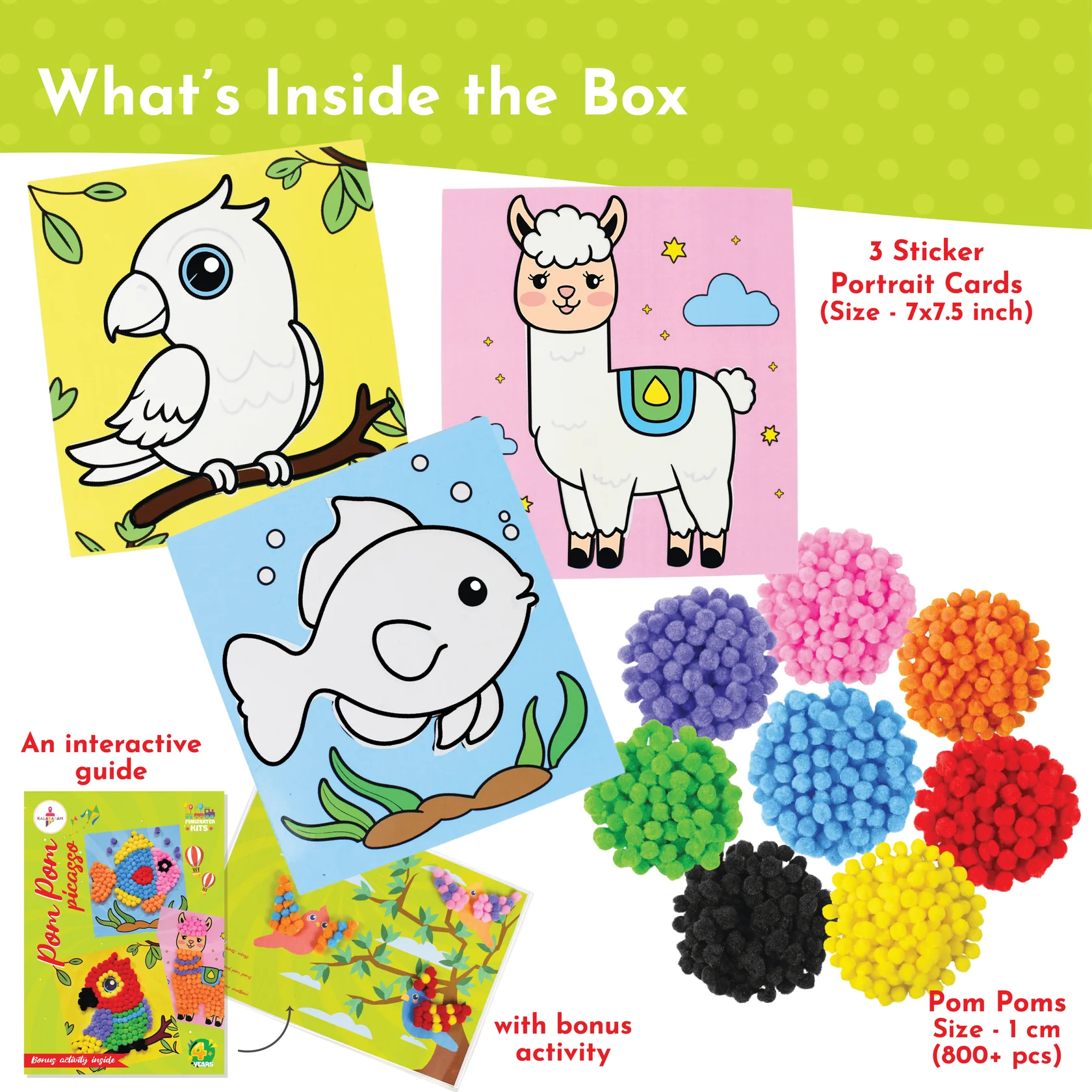 - CREATE STUNNING PORTRAIT CARDS: This engaging kit includes 3 specially designed sticker portrait cards and 800 colourful pom poms to create beautiful mosaic-style artwork perfect for young artists.