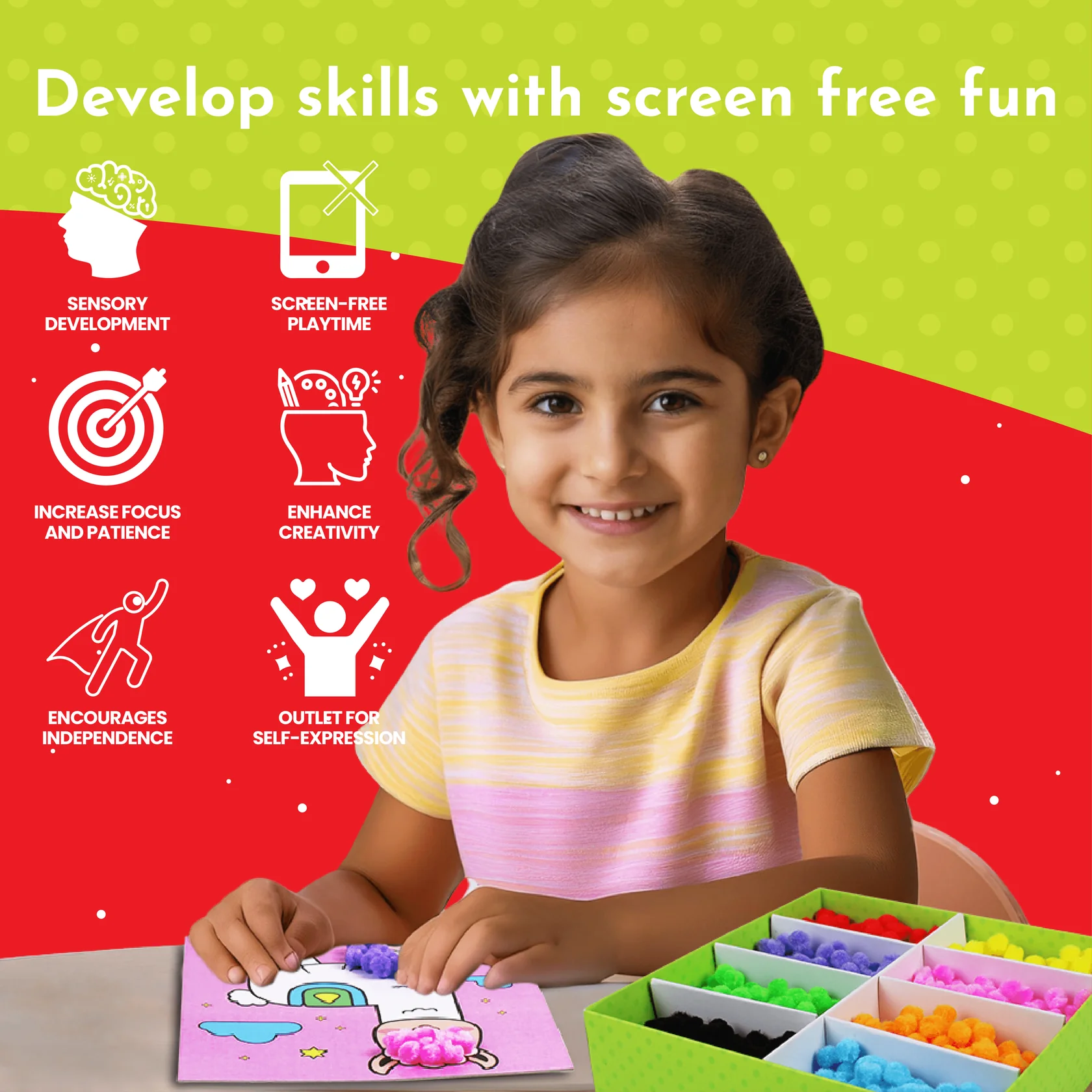 - COLOR RECOGNITION: Working with various colored pom poms helps children develop color recognition and understanding of patterns.