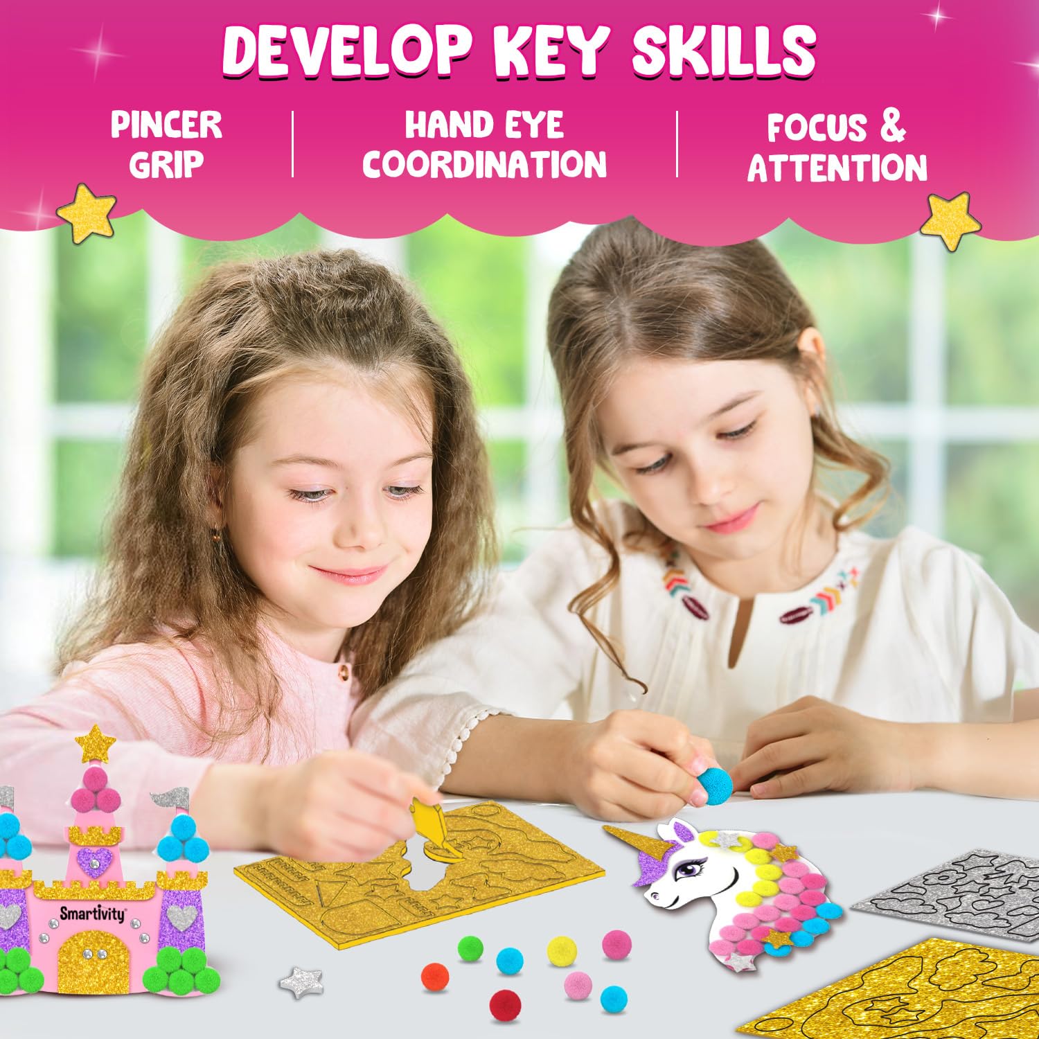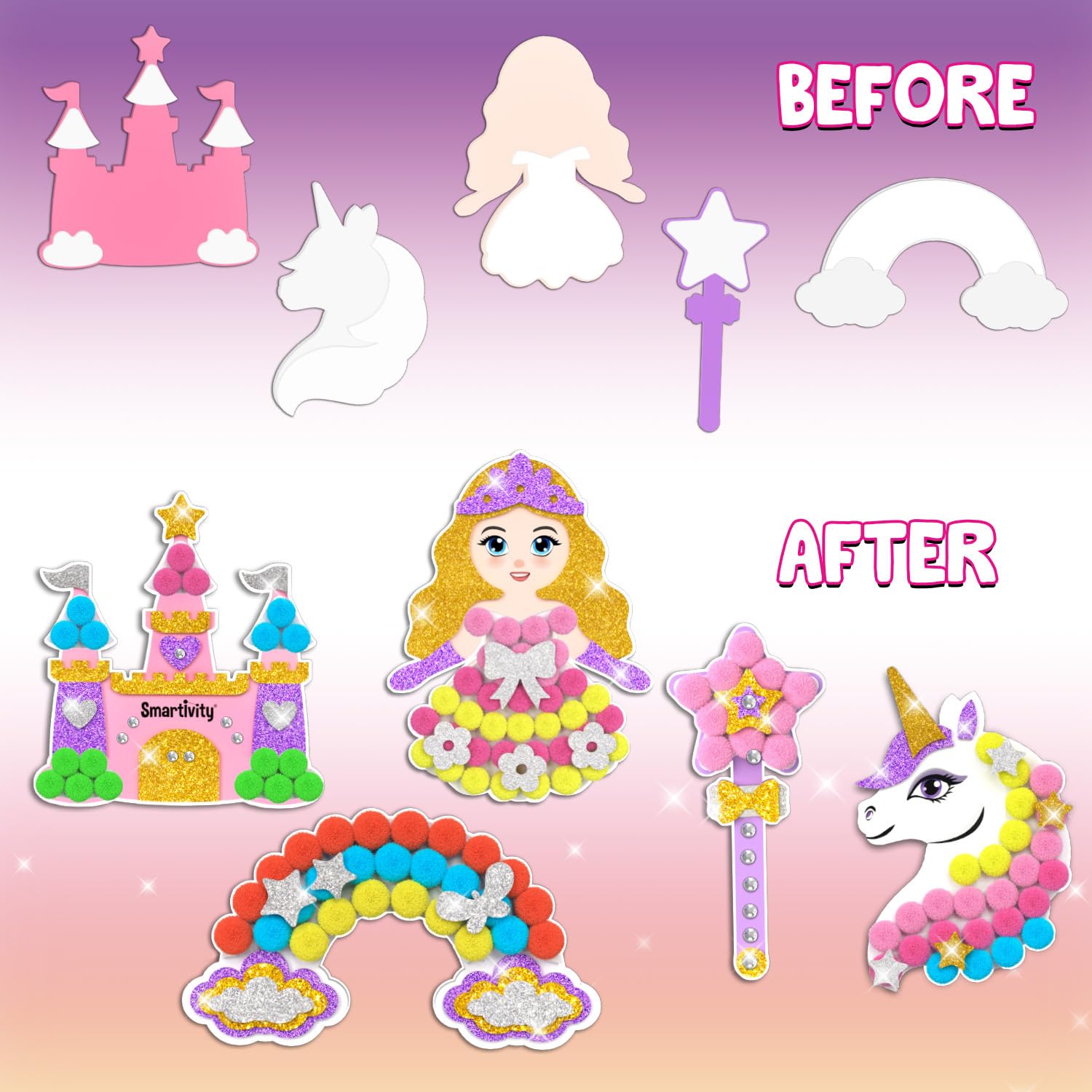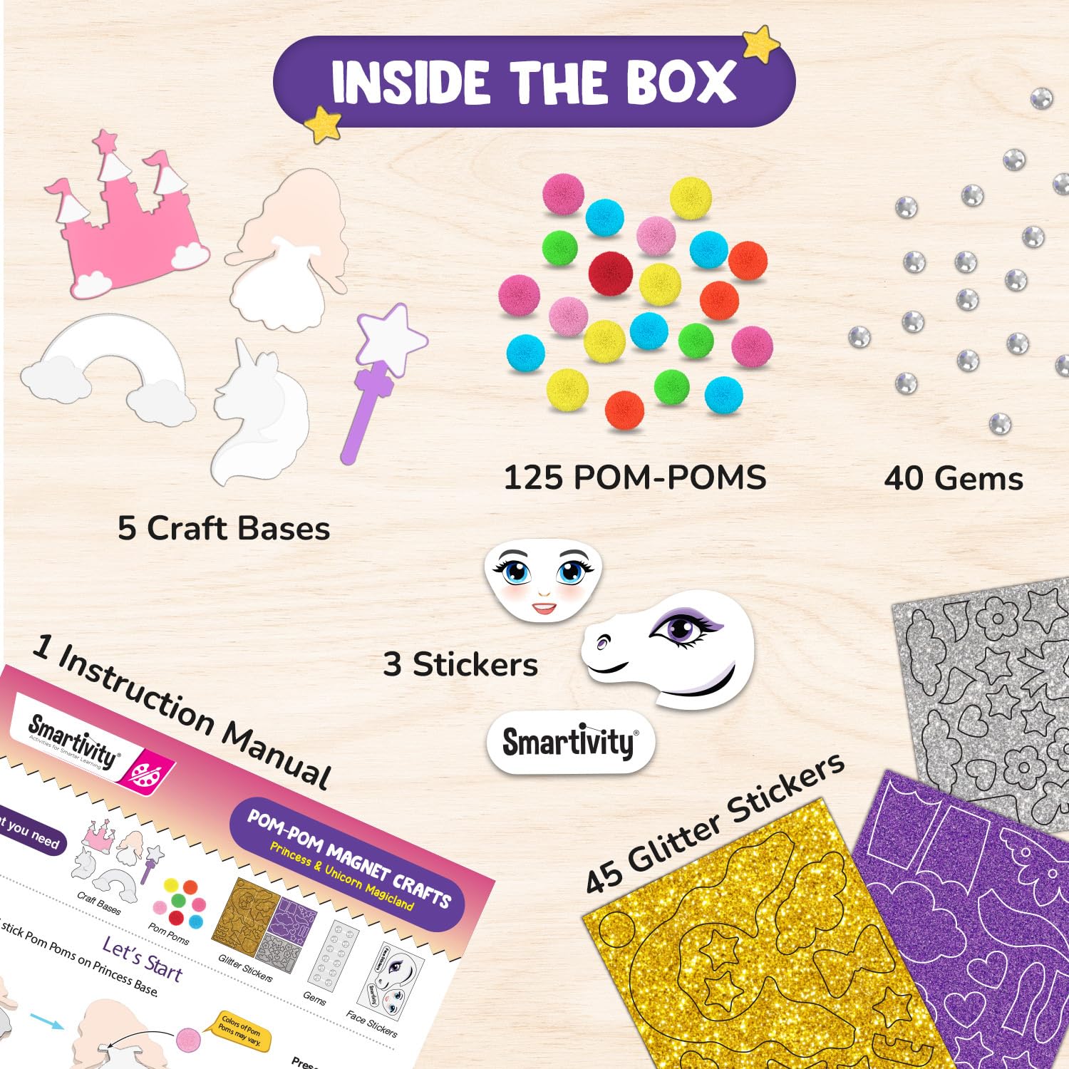 PRINCESS ART&CRAFT KIT FOR KIDS: Kids aged 4 to 10 can decorate fairy tale characters with pom-poms, glittery stickers, and gems, with the Smartivity Pom Pom Magnet Crafts activity kit. MESS-FREE CRAFTING KIT: This DIY art and craft project kit features magical princesses and unicorns, and provides hours of tidy, hands-on crafting fun for kids. SAFE AND NON-TOXIC: Made from high-quality, child-safe materials, this kit ensures worry-free play and safety for little hands. FREE LIFETIME PARTS: Enjoy worry-free play with all parts included and a lifetime supply of replacement parts for endless, uninterrupted fun. EASY STEP-BY-STEP INSTRUCTIONS: The kit includes simple, easy-to-follow instructions, allowing kids to independently complete their craft projects. LOVED BY PARENTS AND KIDS WORLDWIDE: Trusted in 33+ countries, our award-winning toys have earned STEM dot org approval, 2022 Innovative Toy of the Year in the Netherlands, TOTY 2022 Finalist, and Parents dot com Best Toys 2024. PERFECT GIFT FOR CREATIVE KIDS: This art kit is the best birthday or holiday gift for boys and girls who love fairy tales and creative projects. IIT DELHI ALUMNI VENTURE: Designed by IIT Delhi alumni, our toys are rigorously tested for over 100 hours and brainstormed to be age-appropriate, educational, and fun for kids.