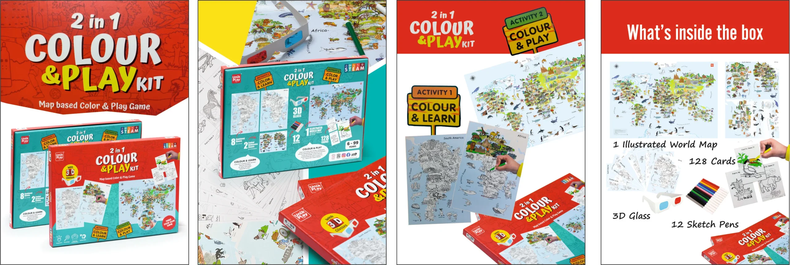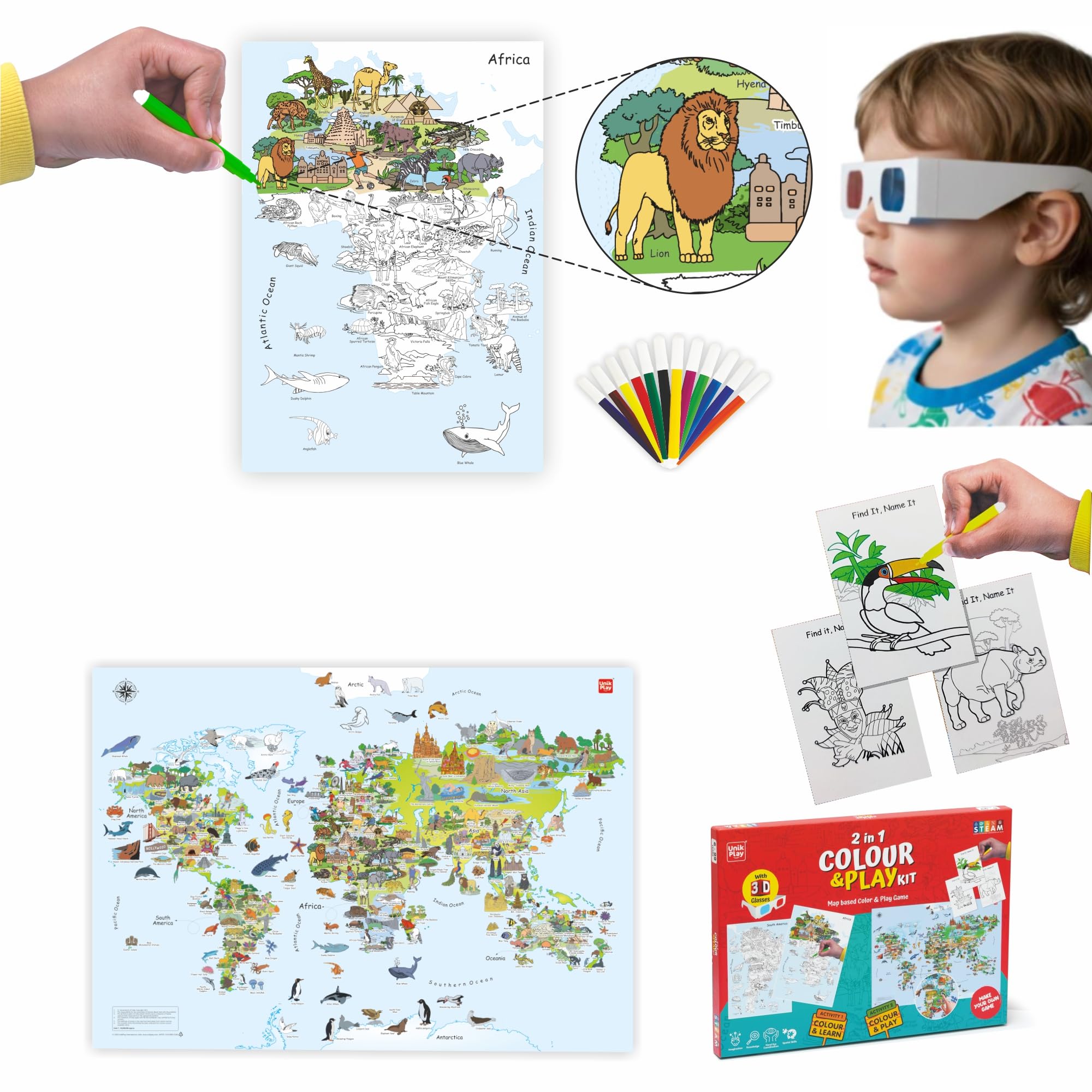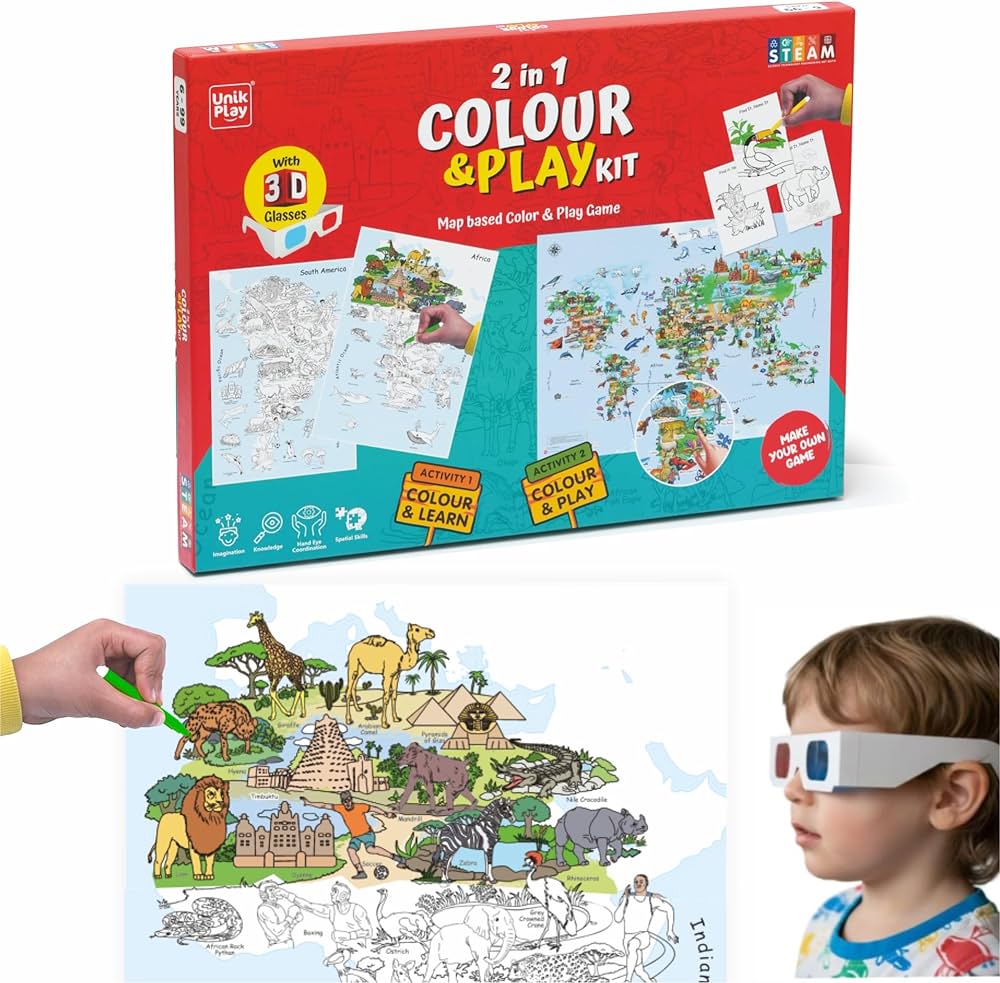 UnikPlay 2 in 1 Color & Play Kit | Geography Colouring Kit & World Map Game |2-in-1 Educational DIY Activity for Kids Age 4+| Includes 3D Glasses, Continent Sheets & Illustrated Map|