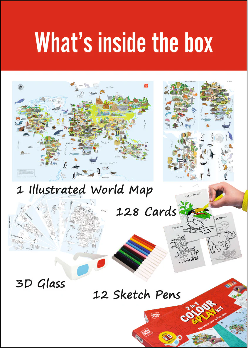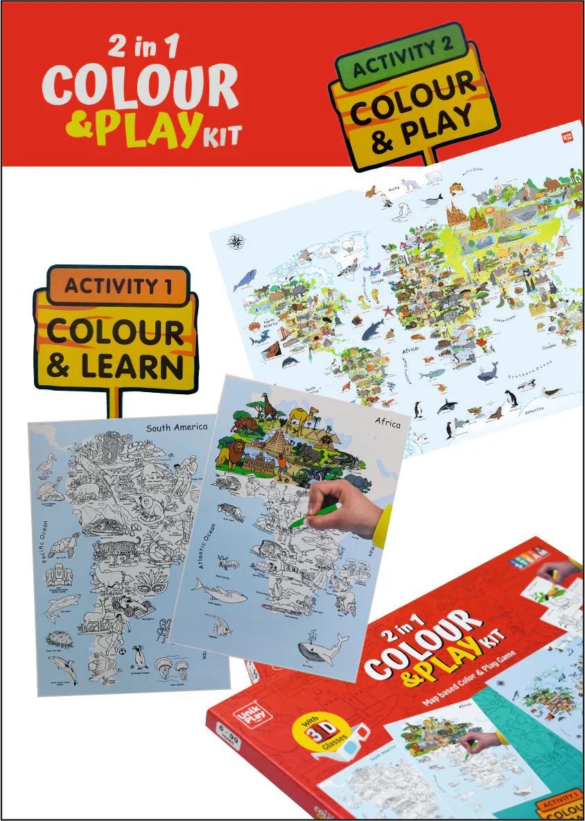 The 2 in 1 Color & Play Kit takes fun and learning to a whole new level! A unique blend of a World Map coloring activity and a geography-based board game for young learners. Kids first engage in a vibrant coloring activity and then dive into a thrilling educational game that brings the world to life through 3D glasses and playful interaction.